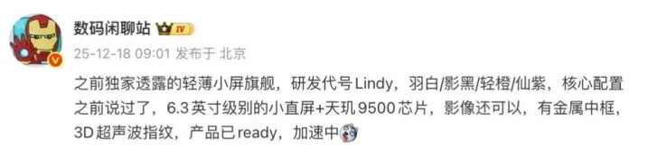 之前独家透露的轻薄小屏旗舰,研发代号Lindy,羽白/影黑/轻橙/仙紫,核心配置之前说过了,6.3英寸级别的小直屏+天玑9500芯片,影像还可以,有金属中框,3D超声波指纹,产品已ready,加速中