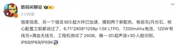 另一个骁龙8E5超大杯已加速,摸到两个新配色,板岩灰/月光石,核心配置之前都说过了,6.71"2808*1256p 1.5K LTPO,7200mAh±电池,120W有线充+满血无线充,工程机测试了24GB,唯一3D超声波+3D人脸识别,IP68/IP69/IP69